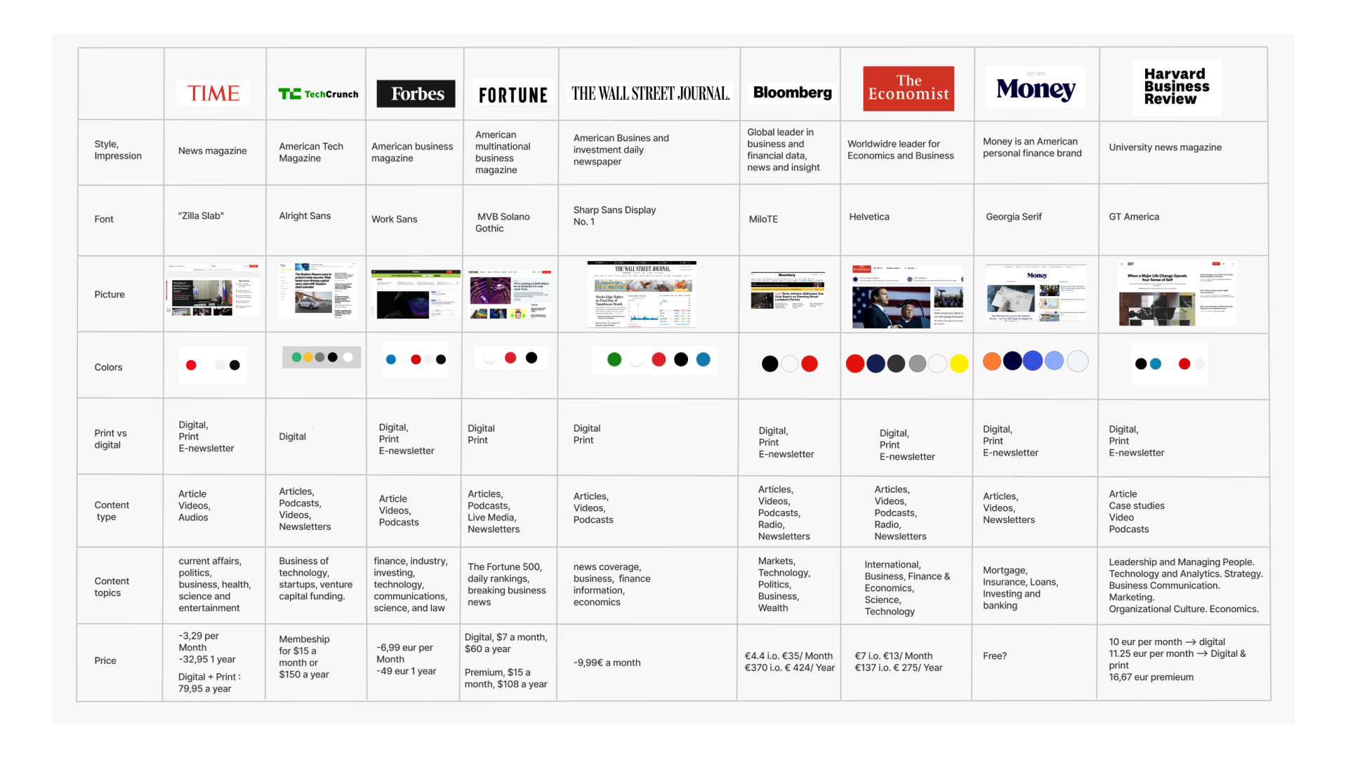 In our business analysis we took into consideration well known economics and business magazines, we checked the average price for their online subscriptions, studied their colours, styles, fonts and finally, we created the table below. As the majority of our respondents said that they were not ready to pay for an online magazine, we wanted to position ourselves among the cheaper offerers, with a free and a paid — but not expensive — option for those who wanted more features. We also wanted to give a “fresh”, younger look to our magazine.