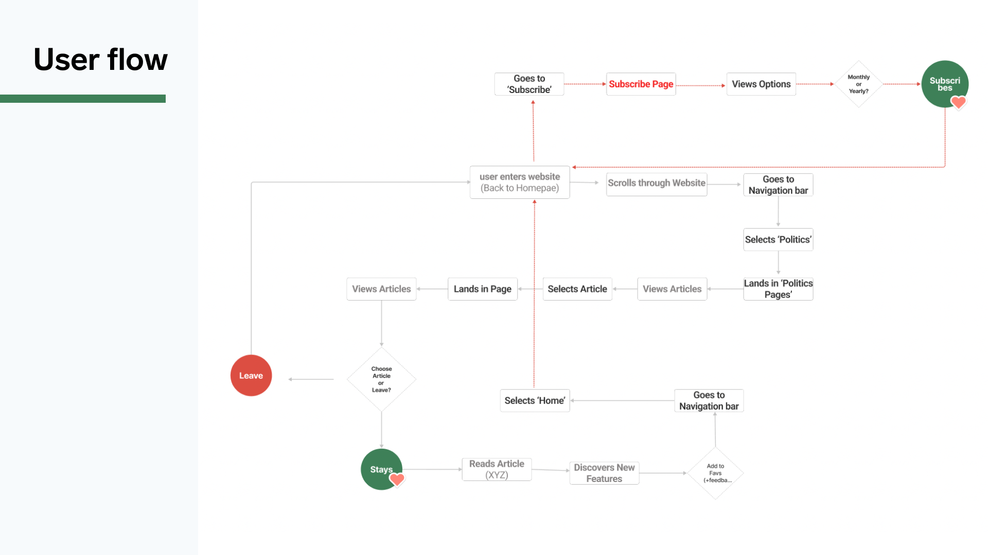 Our next step was to create our Sitemap. We ordered the website into topics and decided what we wanted to build in our prototype, like a subscription pop-up and a sign-in process. That would be shown in the User Flow. We also drew a storyboard, that showed how a potential reader could find out about our magazine.